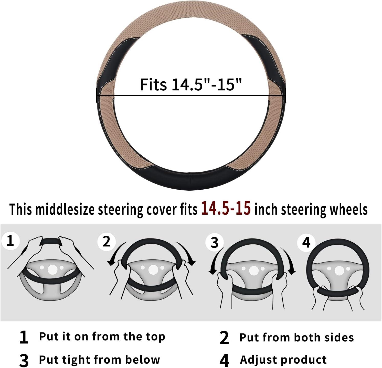 Universal Size: This leather steering wheel cover suitable for all middle-size steering wheels with outer diameter 14 1/2 inch to 15 inch(37cm to 38cm)